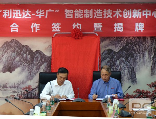 随后,在双方共同见证下,曾志新和霍锦添共同签署协议书,双方代表一起揭牌,标志着利迅达-华广”智能制造技术创新中心正式成立。 此次“利迅达-华广”技术创新中心的成立,是我校校企合作的又一成果。对于进一步强化科研力量,推动产教相融合的教学改革,拓宽学生实习就业渠道,提升学校的影响力和竞争力有着积极意义。