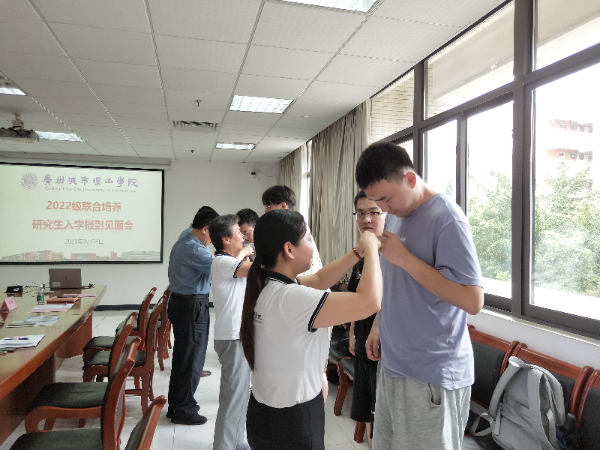 会议最后,导师为2022级联合培养研究生佩戴校徽。各二级学院与研究生就学业、生活和管理等方面进行了讨论。