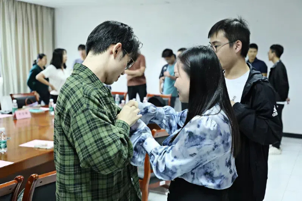 随后,学生们逐一进行自我介绍,分享了自己的学术背景、兴趣爱好及未来规划。会议最后,导师们亲手为每位学生佩戴校徽,该仪式不仅是对学生身份的认可,更是对他们未来学术生涯的美好祝愿。